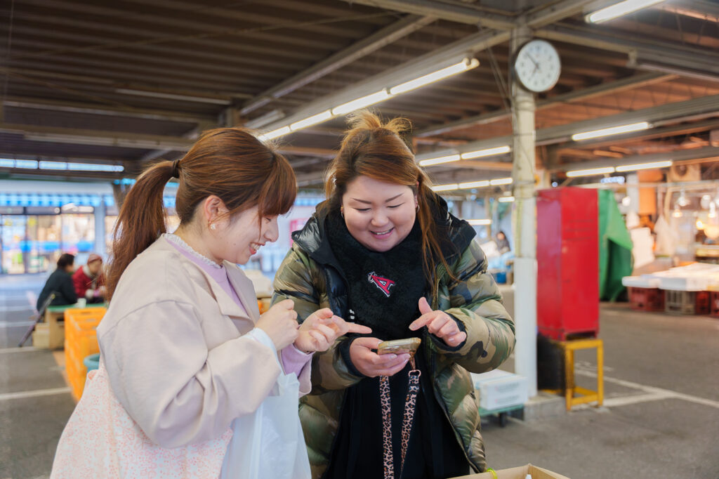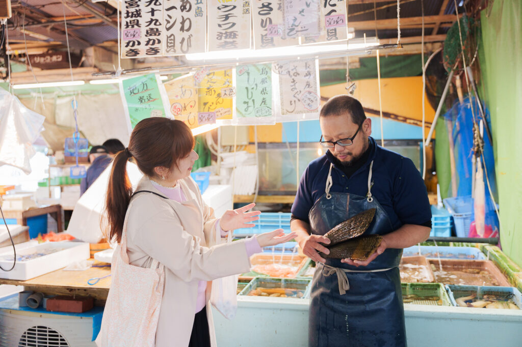 60年以上続く老舗「田中鮮魚店」では、ご姉妹が笑顔で迎えてくれました。ここの魅力は、お魚を選んで『この料理にしたい』と伝えれば、下処理をしてくれるところ。魚の扱いに慣れていなくても、プロの技で美味しい状態にして持ち帰ることができます。