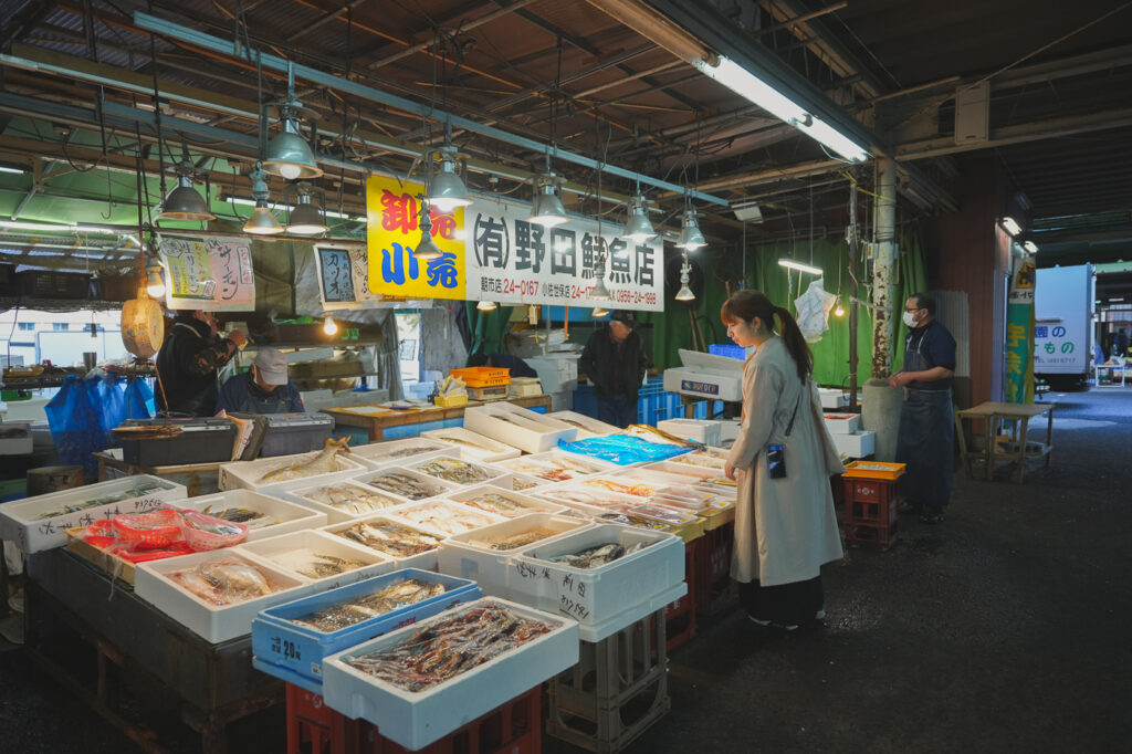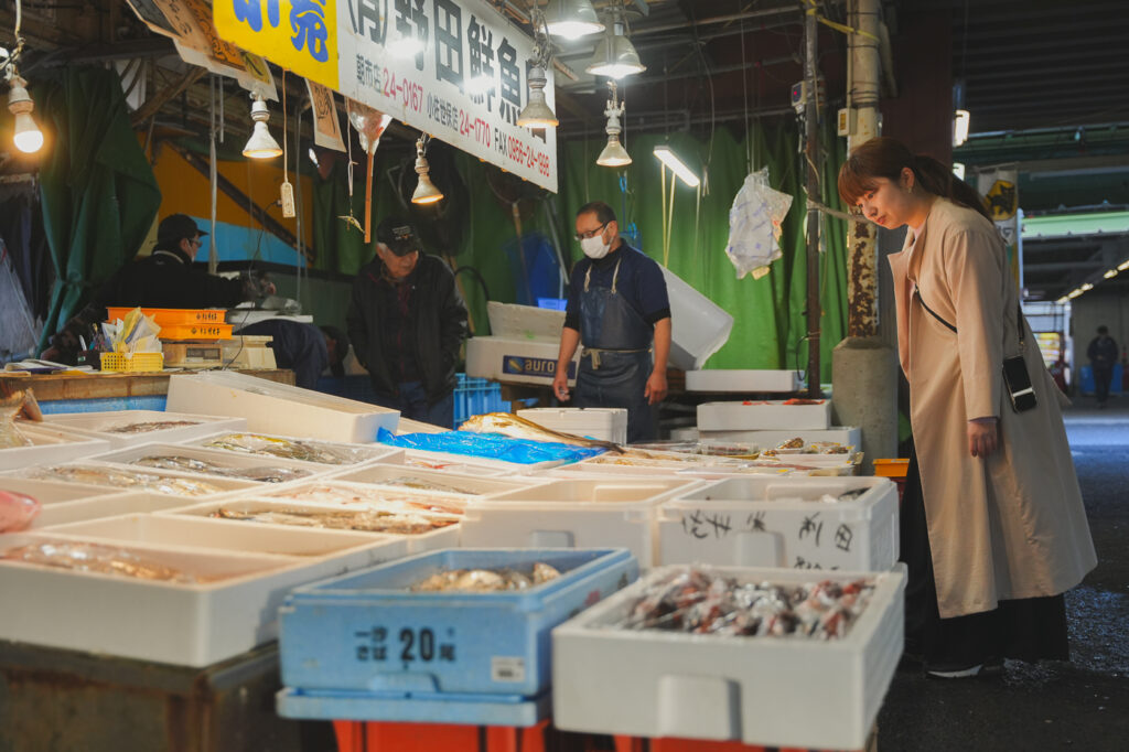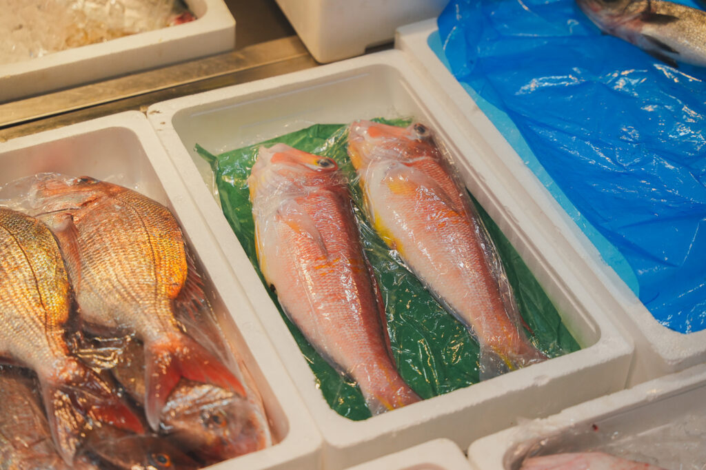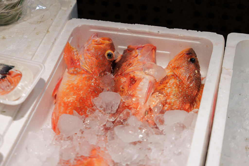 切り身ではなく「一匹丸々」の姿が並ぶ光景は珍しく、小さなお子さん連れの親御さんが食育として、水族館代わりに魚を見せに来ることもあるそうです。 旅行中の方でも安心なのが、田中鮮魚店や野田鮮魚店では冷蔵のクール便での地方発送に対応していること。一度注文して気に入れば、「また良い魚が入ったら送って」とお願いすることもできるのだとか。