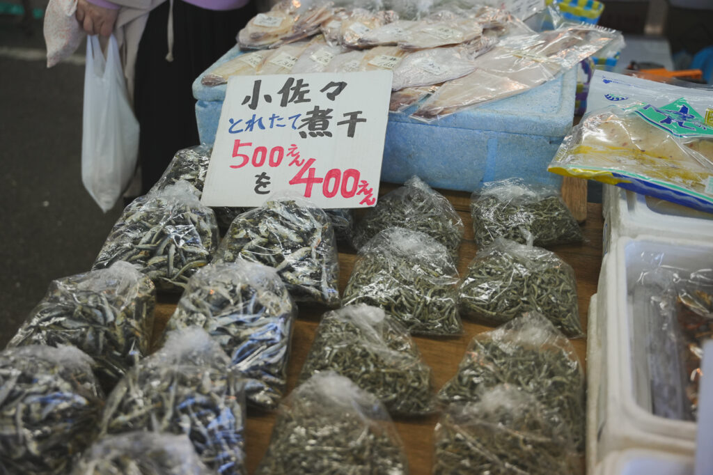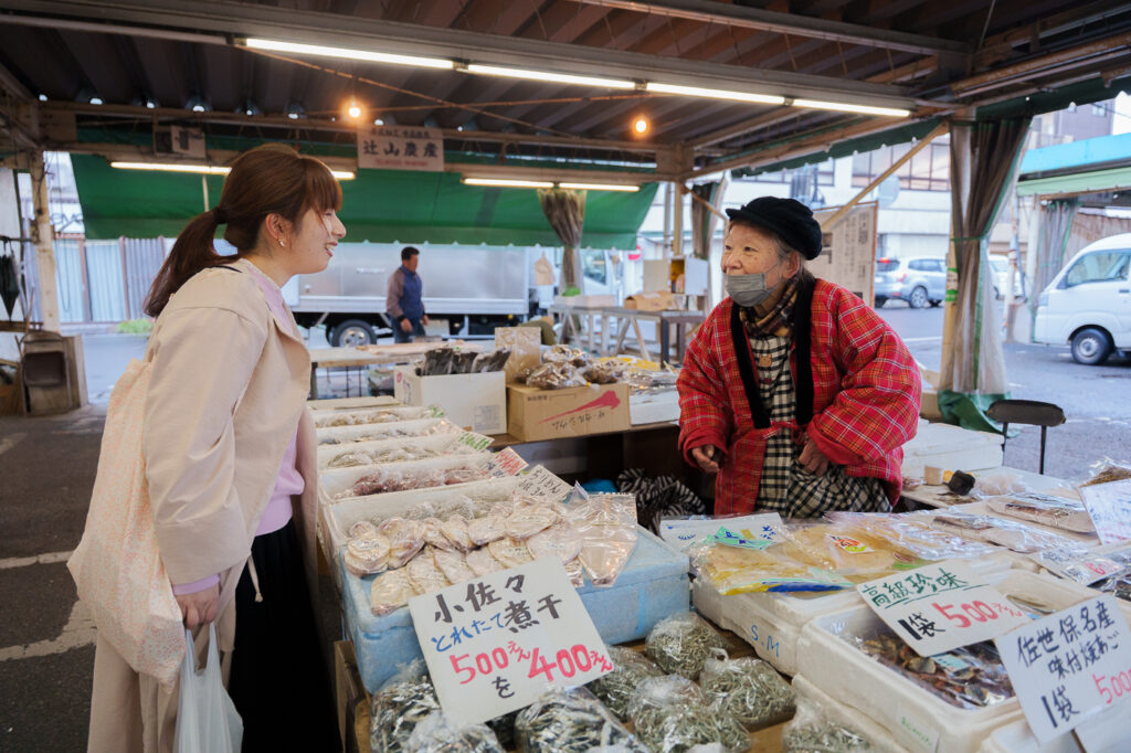 乾物を扱う「美よし水産」さんでは、お客さんの要望に合わせてちりめんやいりこを小分けにしてくれるなど、対面ならではの柔軟なやり取りが交わされています。