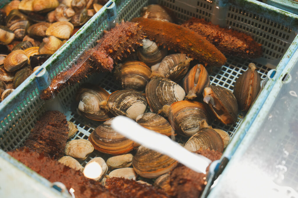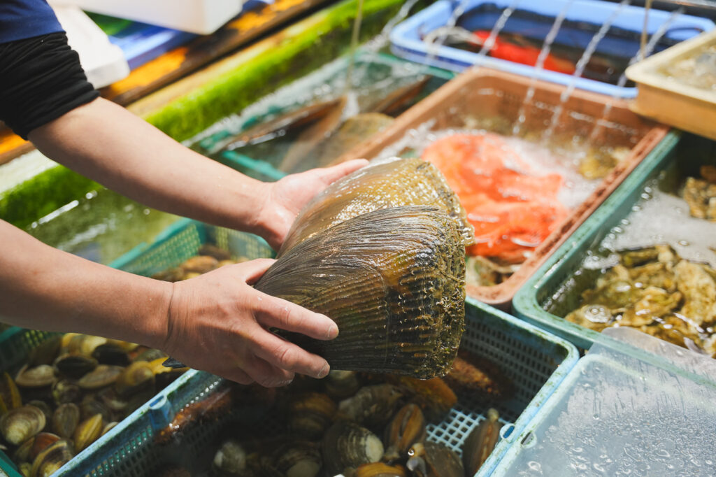 さらに進むと、「野田鮮魚店」があります。ここには網ではなく「釣り」で獲れた鮮度抜群の魚が多く並びます。いけすには生きたタコがいて、大きくて立派なタイラギ(平貝)や、珍しい甘鯛が1匹丸々売られていることも。