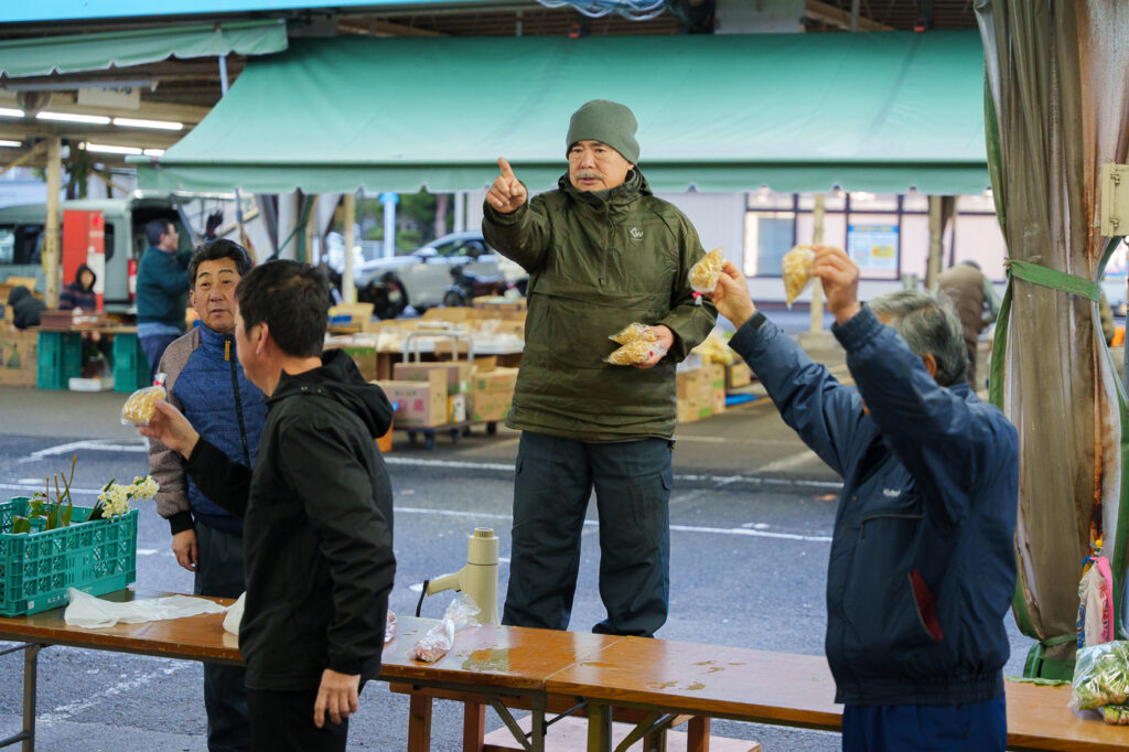 3代続く「池田青果」さんでは、西海や針尾などで採れたみかんやほうれん草にキャベツ、平戸特産の平戸ロマンなどが並びます。袋やカゴに盛られた野菜が「100円」で販売されており、これが朝市名物として大人気です。