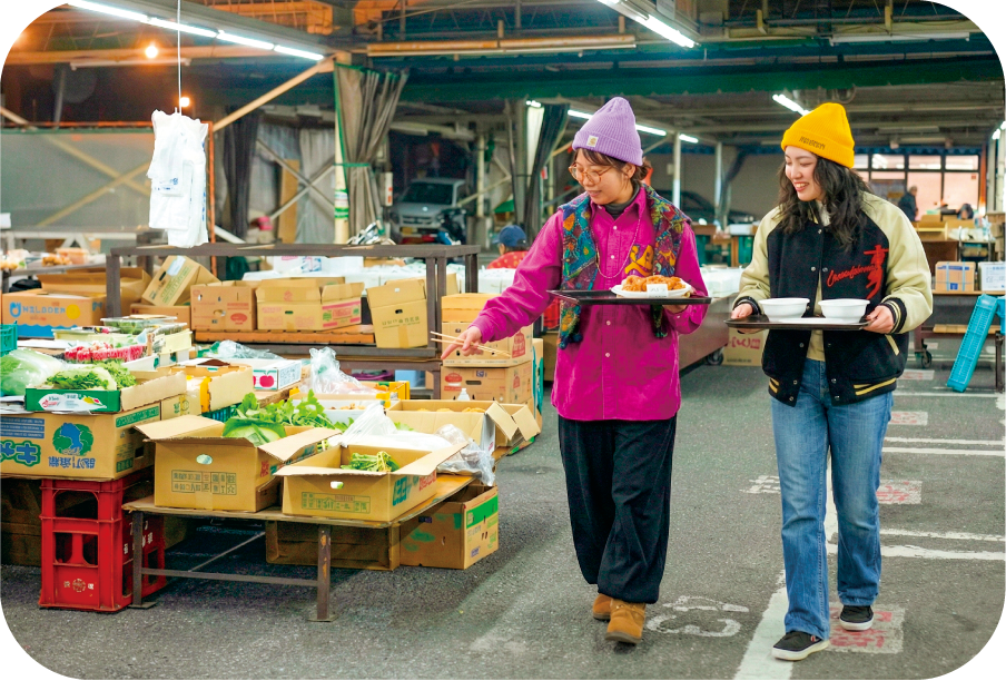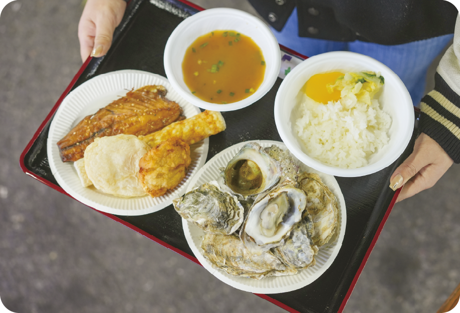 佐世保朝市メシは、そんな朝市を歩きながら気になる食材やおかずを自分で選び、お盆の上にのせて“自分だけの朝ごはん”をつくって楽しむ企画です。その日、その朝にしか並ばない味や、お店の人とのちょっとした会話も朝ごはんのスパイス。早起きした人だけが味わえる、佐世保ならではの特別な朝の時間です。